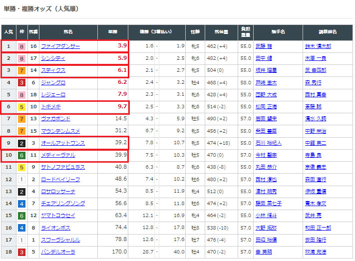 1番人気の⑯ファイアダンサーがまさかの最下位には驚きました。無事であるといいのですが…