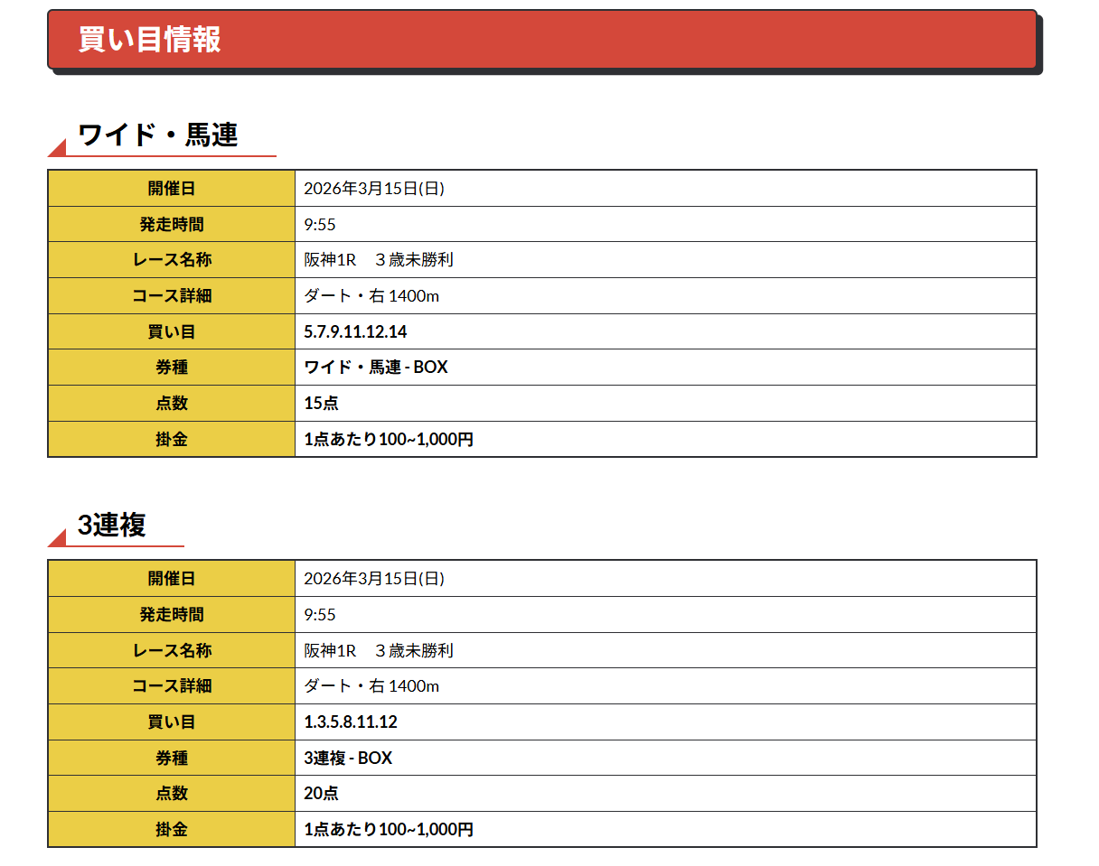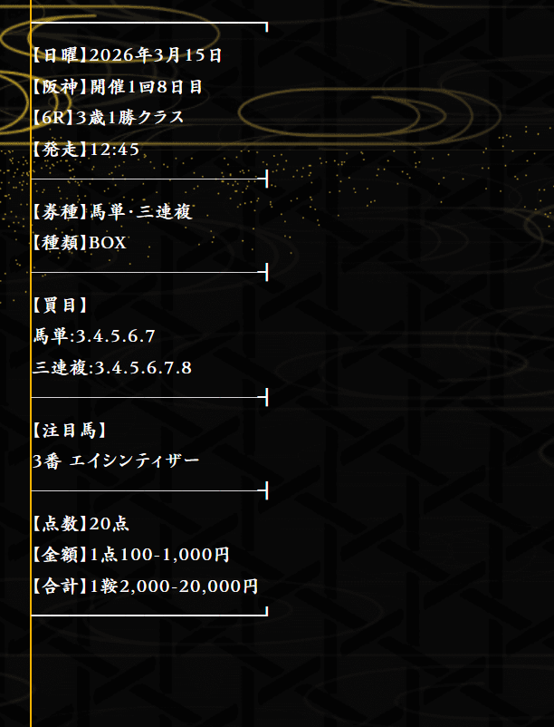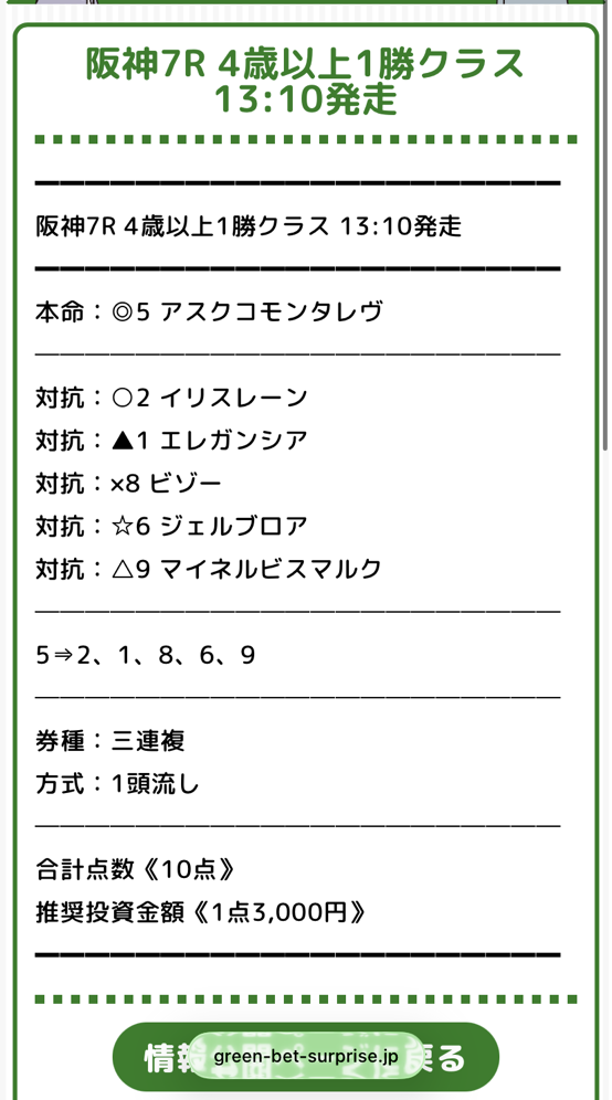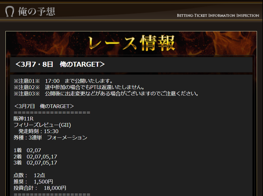 2月末にオススメされてから利用開始しました、まじまじ見るようになったのは3月1日の無料予想からです。 まずは初週となる1日目も当たり、そして2週目の8日に無料予想を利用。 阪神8Rドンピシャでしたねしかも買い目6点とか点数絞って最高です! 今週の結果は6万5600円の的中でした、3週目もリピート確定ですね。