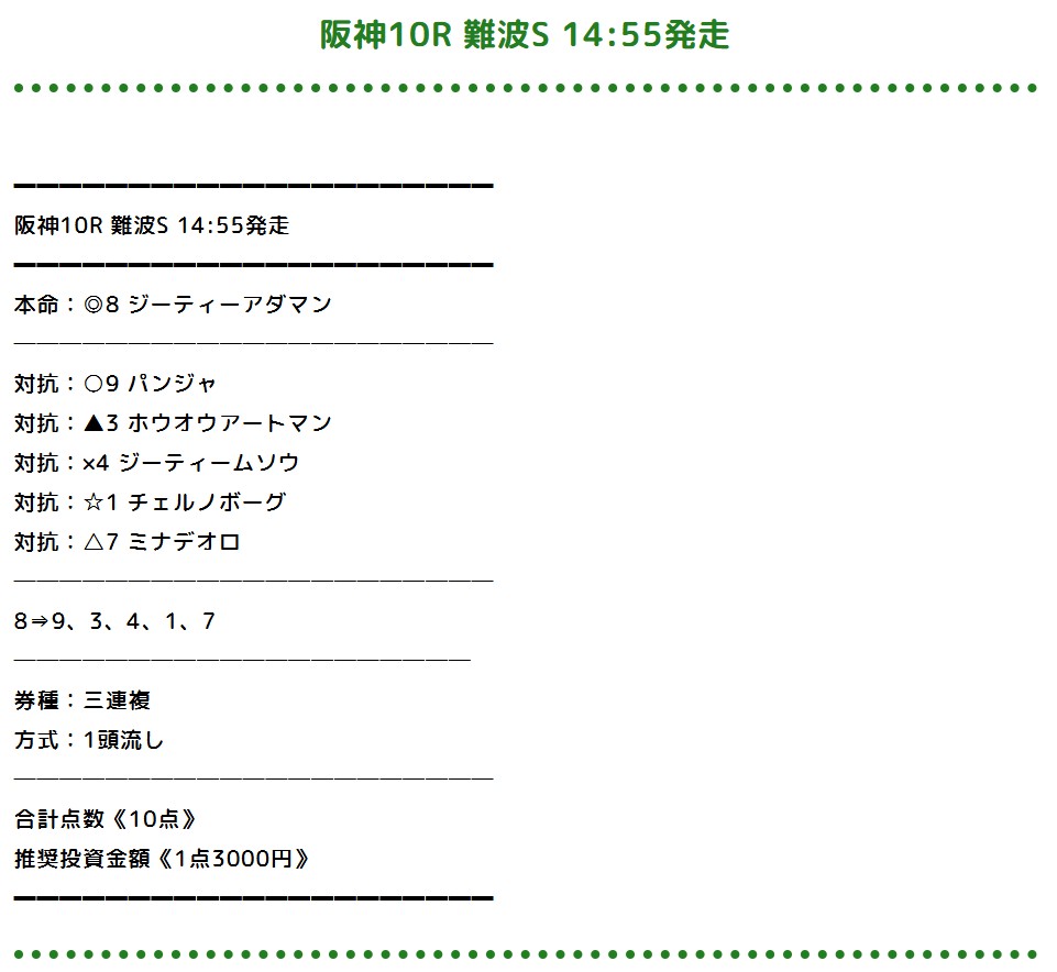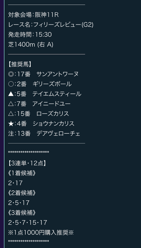 的中ありがとうございます。 3連単のフォーメーションの組み方や配当の振り分けなどかなり参考になりました。 自分は夜型人間なので、予想が今回くらいの公開時間だと助かります。