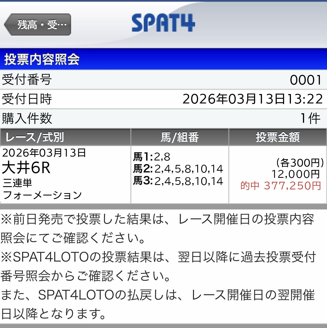 3連単4-1-6でで356.3倍的中 500円~って書いてあったからケチ魂が出てしまい当たったのに満額配当の半分178,150円。 千円で賭けていたら×2倍だったから惜しかったな。 次は満額勝負!