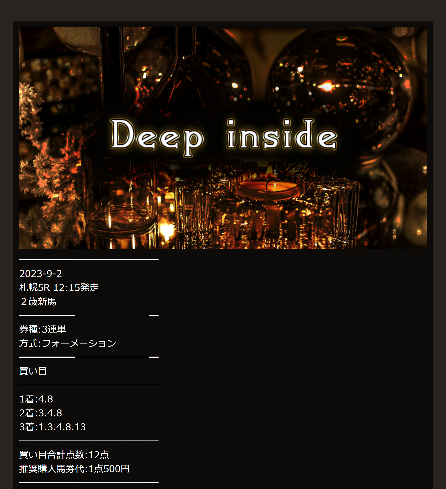 先週の土曜日8/27日曜日に無料情報だけで15万150円ゲットできたから今週の無料情報公開も楽しみにしてます! 今週も10万OVER的中したら貯まった配当で有料情報参加してみたいと思います!